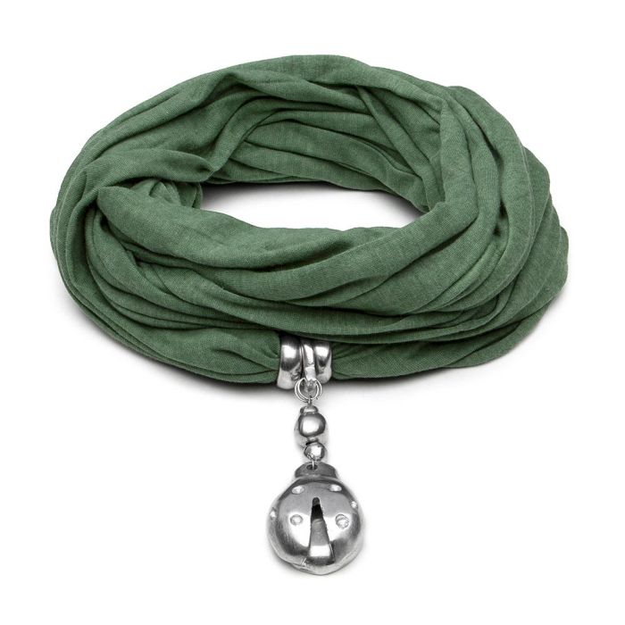 Sciarpa gioiello ciondolo coccinella. Colore kaki. Tessuto in jersey. Realizzato a mano in alluminio 100% riciclato. Nickel tested. Lavorazione artigianale.