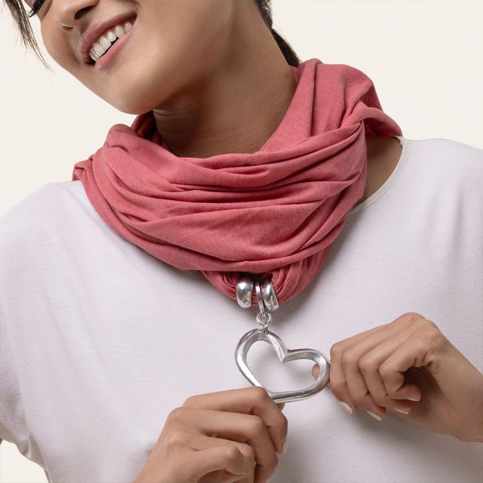 Sciarpa gioiello in tessuto jersey con pendente cuore. Realizzata a mano in alluminio 100% riciclato.